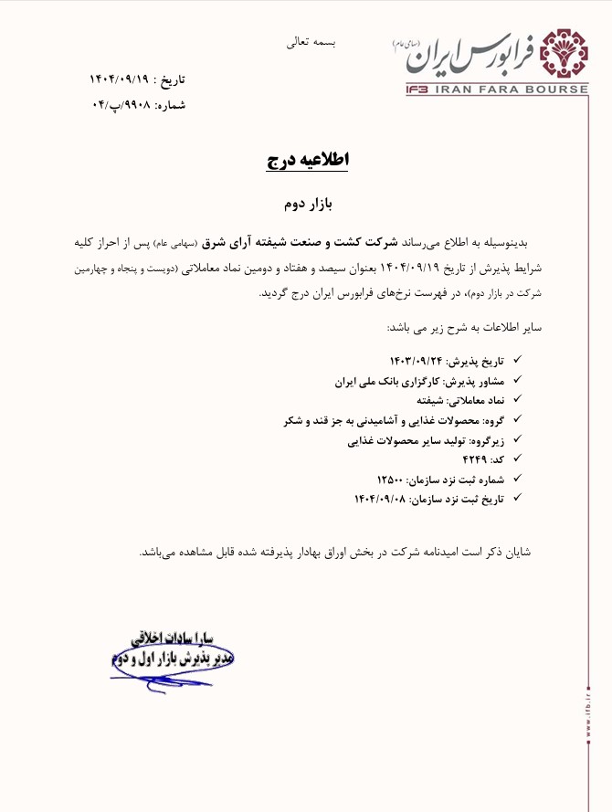 شرکت کشت و صنعت شیفته آرای شرق (سهامی عام)، از اعضای خوشنام سندیکای صنایع کنسرو ایران، از تاریخ ۱۹ آذر ۱۴۰۴ به عنوان سیصد و هفتاد و دومین نماد معاملاتی و دویست و پنجاه و چهارمین شرکت بازار دوم، در فهرست نرخهای فرابورس ایران درج شد.
